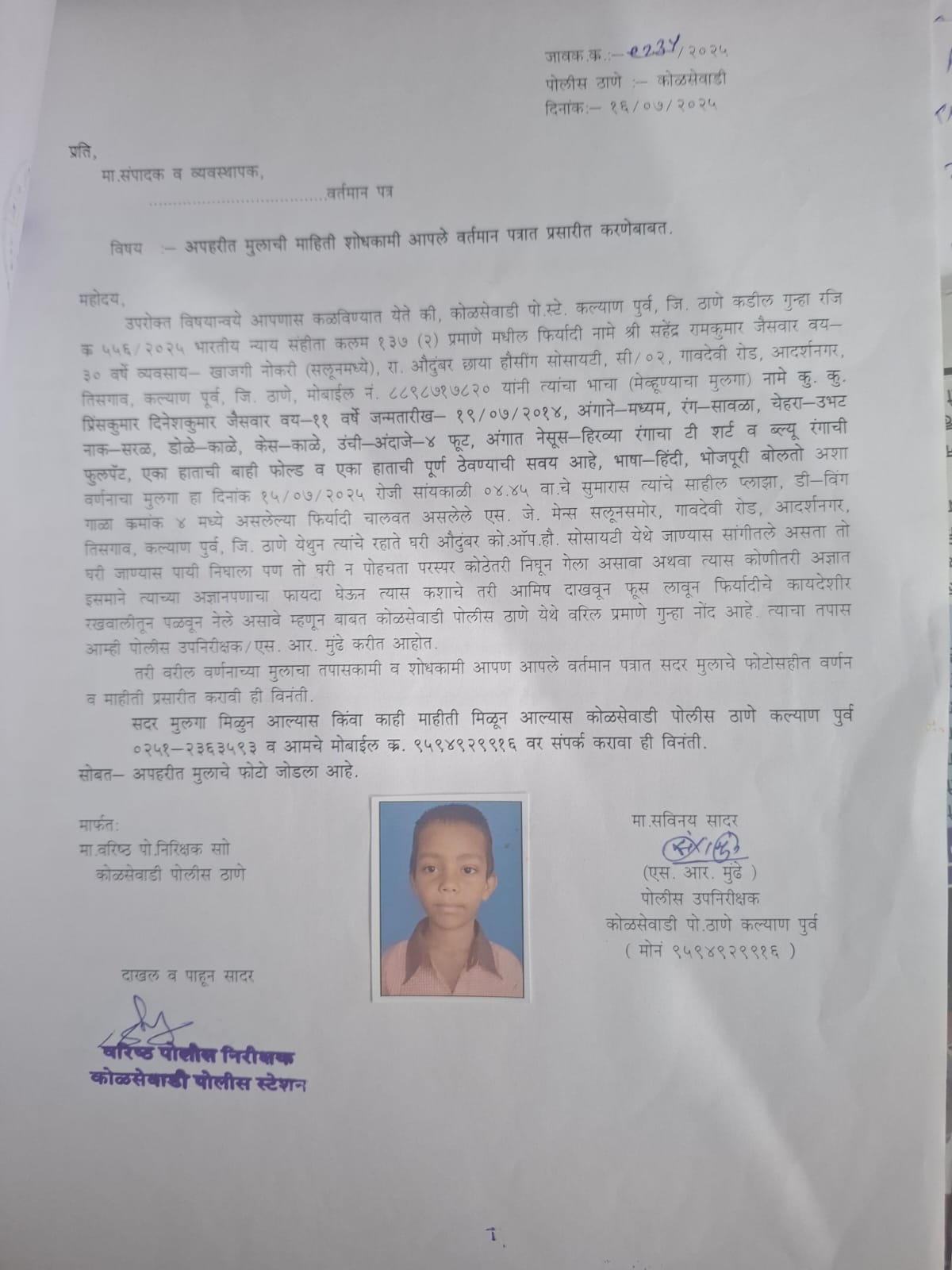 कल्याण :- कल्याण पूर्वमधील तिसगाव परिसरातून एक 11 वर्षांचा मुलगा रहस्यमयरित्या बेपत्ता झाला असून, त्याच्या अपहरणाची शक्यता वर्तवण्यात येत आहे. प्रिन्सकुमार दिनेश जैसवार असे या मुलाचे नाव असून तो औदुंबर छाया को-ऑपरेटिव्ह हाऊसिंग सोसायटी, आदर्श नगर, गावदेवी रोड, तिसगाव, कल्याण पूर्व येथे वास्तव्यास होता. मूळचा उत्तर प्रदेशातील जौनपूर जिल्ह्यातील हा मुलगा 15 जुलै 2025 रोजी दुपारी 4.45 वाजण्याच्या सुमारास साहिल प्लाझा परिसरातून अचानक बेपत्ता झाला.