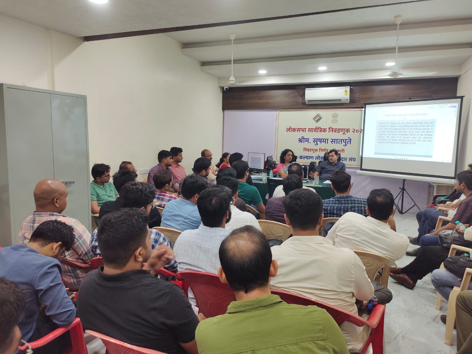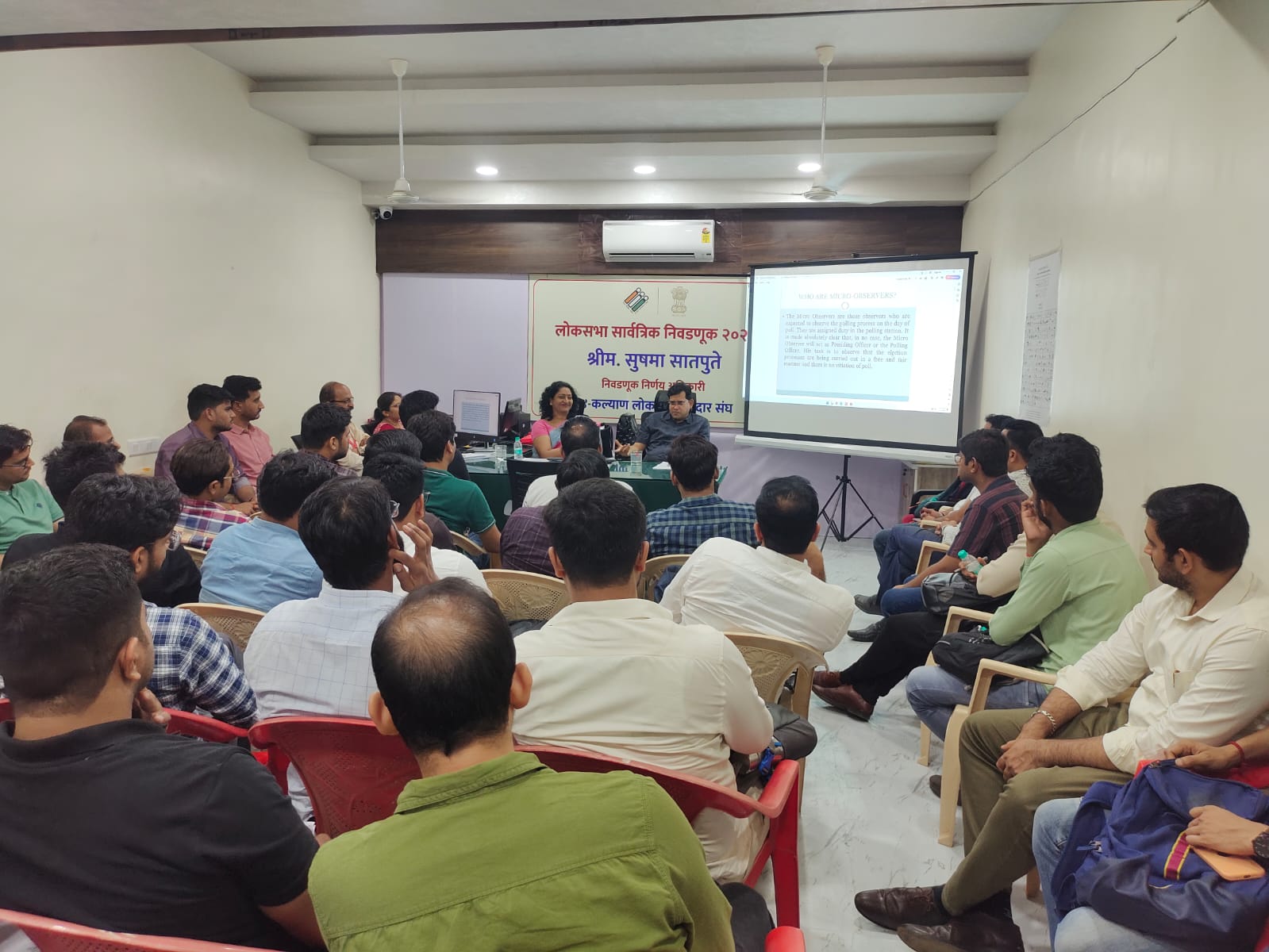 दि. 20 मे 2024 रोजी, 24-कल्याण लोकसभा मतदार संघात संपन्न होणा-या सार्वत्रिक निवडणूकीच्या पार्श्वभूमीवर आज 39 सूक्ष्म निरीक्षक 24-कल्याण लोकसभा मतदार संघात दाखल झाले असून ते मा. निवडणूक निरीक्षक यांच्या करीता काम करणार आहेत. या सूक्ष्म निरीक्षकांना आज सूक्ष्म निरीक्षकांच्या कर्तव्याबाबत, मतदान यंत्र हाताळणीबाबत, तसेच निवडणूक प्रक्रियेबाबत पॉवरपॉईंट सादरीकरणाच्या माध्यमातून प्रशिक्षण देण्यात आले. यावेळी मा.निवडणूक निरीक्षक (सर्वसाधारण) मनोज जैन, निवडणूक निर्णय अधिकारी सुषमा सातपुते, पदनिर्देशित अधिकारी तथा सहा.निवडणूक निर्णय अधिकारी वैशाली लंभाते उपस्थित होत्या. सूक्ष्म निरीक्षक दि. 20 मे 2024 रोजी, मतदानाच्या दिवशी संपन्न होणा-या मतदान प्रक्रियेचा अहवाल मा.निवडणूक निरीक्षक (सर्वसाधारण) मनोज जैन यांना सादर करतील.