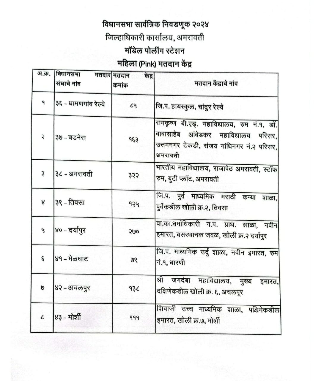 न.प. प्राथ. मराठी शाळा क्र.४, आठवडी बाजार (पश्चिम बाजू) खोली क्र. २, अंजनगांव सुर्जी४१- मेळघाट८७जि.प. माध्यमिक मराठी शाळा, रुम नं.१, दिया (ता. धारणी), ४२-अचलपुर२११नगर परिषद विद्यालय, नवीन इमारत, मराठी माध्यम खोली क्र.३, चांदुर बाजार ४३ -मोर्शी१८५जि.प. पूर्व माध्यमिक शाळा, पश्चिमेकडील इमारत, खोली क्र. १,पुसला याचा समावेश आहे.