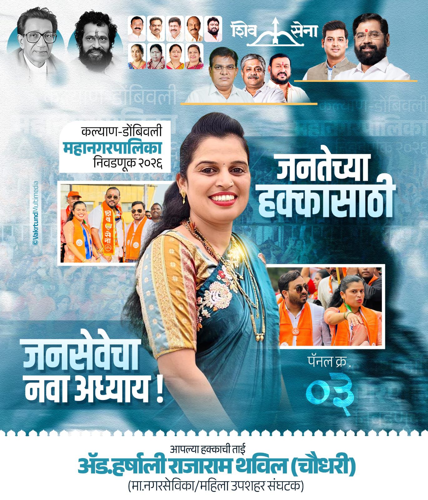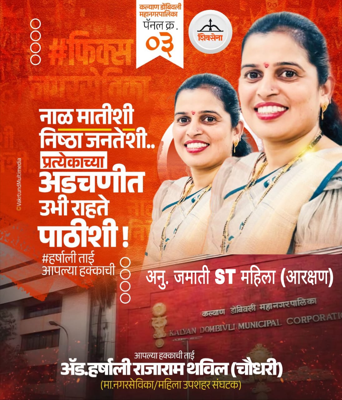 टिटवाळा :- कल्याण डोंबिवली महापालिकेच्या माजी नगरसेविका तसेच माजी स्थायी समिती सदस्य व शिवसेना महिला उपशहर संघटक अॅड. हर्षाली राजाराम थविल (चौधरी) पॅनल क्रमांक ३ मधून अनुसूचित जमातीच्या महिला आरक्षणामधून निवडणूक लढवणार आहेत. अॅड. हर्षाली राजाराम थविल (चौधरी) ह्या अभ्यासू व उच्चशिक्षित पदवीधर असून त्यांचे बीएमएस,एलएलबी चे शिक्षण पूर्ण झालेले आहे. त्यांनी त्यांच्या मागील नगरसेवक पदाच्या कार्यकाळात वडवली व मोहने जोडनारा ब्रीज (ROB) बनविला. वडवली गेट नं.४७ ते गेट नं.४८ मुख्य रस्ता डांबरीकरण व गटार नविन तयार करण्यात आले. वडवली गावातील स्मशानभुमी नविन बांधण्यात आली. वडवली गावातील स्मशानभुमीकडे जाणारा रस्ता नविन तयार करण्यात आला. वडवली गावातील गावदेवी मंदिर जवळ ओपन जिम बसवण्यात आली. वडवली गावातील स्मशानभुमी जवळ नवीन गणेश घाट तयार करण्यात आला. ‘अ’ प्रभाग क्षेत्र कार्यालया जवळील आरोग्य केंद्र दुरूस्त करण्यात आले. वडवली गावातील मुख्य रस्त्याचे डांबरीकरण केले.वडवली गावातील आदिवासीपाड्यातील मुख्य रस्ता नविन तयार करण्यात आला.अटाळी गावातील स्मशानभुमी नविन बांधण्यात आली व जुनी स्मशानभुमी दुरूस्त करण्यात आली.अटाळी गावातील हनुमान मंदिर ते टेपा पर्यंत नविन रस्ता बनविण्यात आला. अटाळी गावातील स्मशानभुमीचा रस्ता बनवण्यात आला. वडवली - अटाळी प्रभागात विविध ठिकाणी नविन जलवाहिनी टाकण्यात आल्या.वडवली- अटाळी प्रभागात विविध ठिकाणी पोहचरस्ते व गटार पायवाटा बनविण्यात आले. वडवली गावातील गणेश मंदिर जवळ कोळी पुतळा बनविण्यात आला.वडवली अटाळी प्रभागात नविन पथदिवे व हायमास्ट लाईट्स बसवण्यात आले. वडवली - अटाळी प्रभागात शौचालये दुरूस्त करण्यात आले. तसेच त्यांच्या प्रभागात महाराष्ट्र शासनाचा तब्बल सात कोटी रुपयांचा विशेष निधी वापरून विकास कामे करण्यात आले. त्यामुळे त्यांनी आपल्या प्रभागात मुलभूत सोयी सुविधा यांना प्रामुख्याने प्राधान्य देत विकास कामे केलेली आहेत. त्यांच्या या कामांची पोचपावती म्हणून पॅनल क्रमांक ३ मधून अनुसूचित जमातीच्या महिला आरक्षणामधून त्या पुन्हा निवडणूक लढवणार आहे. आपल्या या विकास कामांची दखल मतदार नक्कीच घेतील अशी त्यांना आशा वाटते. जनतेच्या हक्कासाठी जनसेवेचा नवा अध्याय घेऊन नाळ निष्ठा जनतेची प्रत्येक अडचणीत उभी राहते पाठीशी हे ब्रीद वाक्य वापरीत त्यांनी आपल्या विकास कामांचा लेखाजोखा मांडलेला आहे. त्यांच्या या कामात उपमुख्यमंत्री एकनाथ शिंदे,खासदार श्रीकांत शिंदे,आमदार विश्वनाथ भोईर,माजी नगरसेवक दुर्योधन पाटील यांचेही मोलाचे सहकार्य मिळत असल्यानेच आपण या विश्वासावरच पुन्हा नशीब आजमावत असल्याचे थवील यांनी सांगितले.