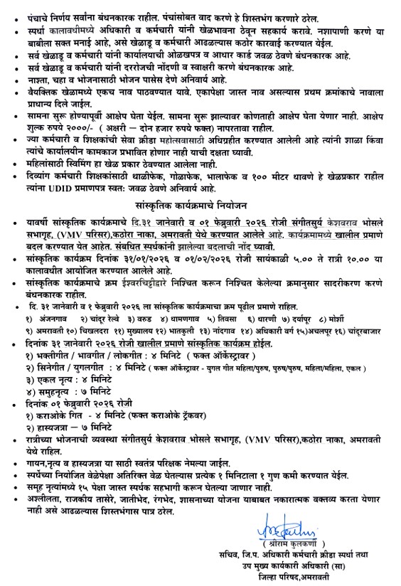 दिनांक ३१ जानेवारी २०२६ रोजी सांस्कृतिक कार्यक्रम होईल.१) भक्तीगीत / भावगीत / लोकगीत: ४ मिनिटे (फक्त ऑर्केस्ट्रावर) २) सिनेगीत : ४ मिनिटे (फक्त ऑर्केस्ट्रावर युगल गीत महिला/पुरुष,पुरुष/पुरुष,महिला/महिला, एकल)३) कराओके : ४ मिनिटे,४) एकल नृत्य : ४ मिनिटे दिनांक १फेब्रुवारी २०२६ रोजी १) हास्य जत्रा ७ मिनिटे २) समूहनृत्य - ७ मिनिटे होणार आहे. क्रिकेट (दि.३१ जानेवारी २०२६ ला सकाळी ०९.०० वाजता पासून भाग्यपत्रकानुसार सुरु करण्यात येईल.हे सामने श्रीमती नरसम्मा महाविद्यालय,किरण नगर, जूना बायपास रोड, अमरावती येथे होणार अशी माहीती श्रीराम कुलकर्णी सचिव,जि.प. अधिकारी कर्मचारी क्रीडा स्पर्धा तथा उप मुख्य कार्यकारी अधिकारी (सा) जिल्हा परिषद,अमरावती,क्रीडा संयोजक डाॅ.नितिन उंडे यांनी दिली आहे असे क्रीडा महोत्सवाच्या प्रसिध्दी समितीने कळविले आहे.