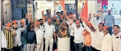 शिरूर बाजार समिती आवारातील छत्रपती शिवाजी महाराजांच्या पुतळ्याजवळ सकल मराठा समाज संघटना,मराठा महासंघ, श्रीराम सेना तसेच इतर सामाजिक संघटनेच्या कार्यकर्त्यांनी एकत्रित येऊन फटाक्यांची आतषबाजी,गुलालाची उधळण करत ढोल ताशांच्या गजरात एक मराठा -लाख मराठा,मनोज जरांगे पाटील झिंदाबाद अशा घोषणा देत छत्रपती शिवाजी महाराजांच्या पुतळ्याला पुष्पहार अर्पण करून आनंदोत्सव साजरा केला.