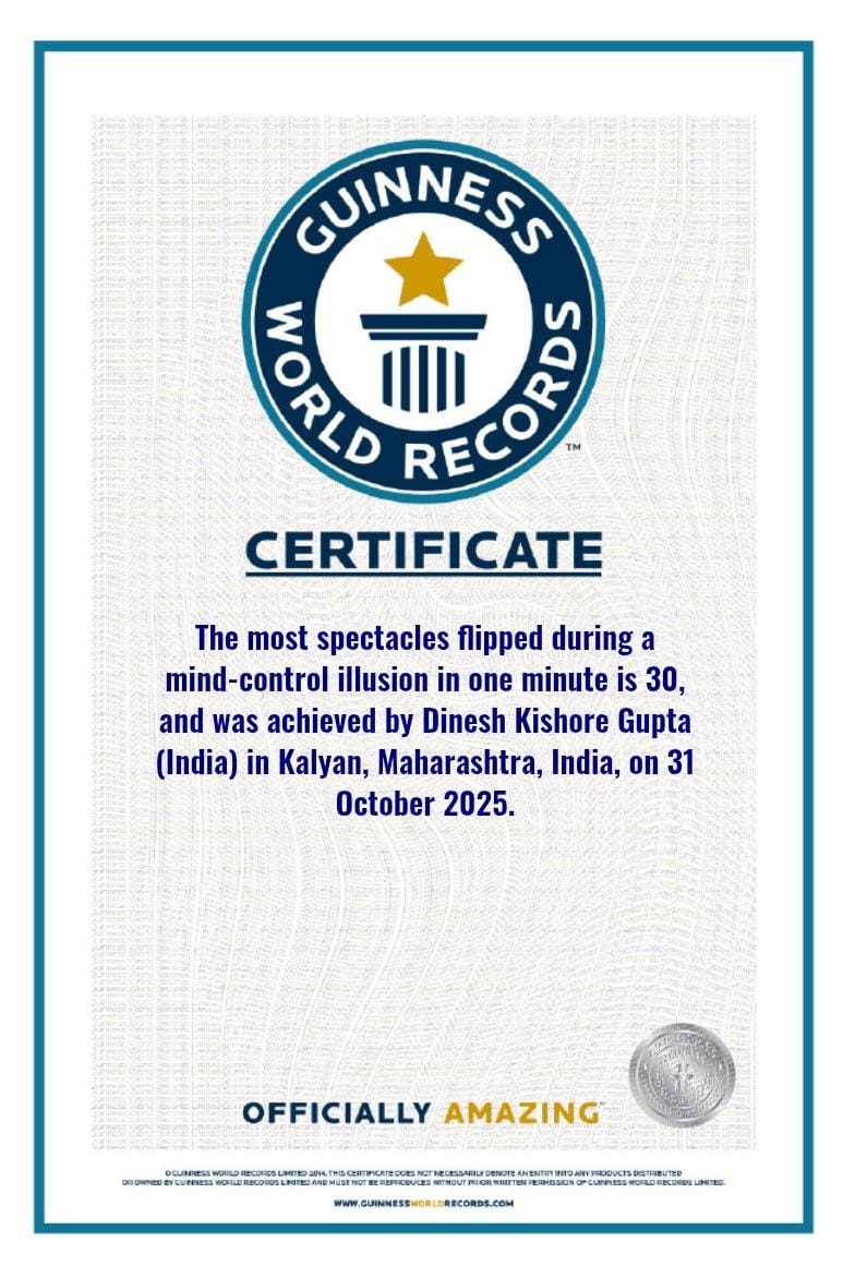 कल्याण (महाराष्ट्र):- राष्ट्रीय एकता दिनानिमित्त प्रेरक वक्ते आणि मेंटलिस्ट प्रो. डॉ. दिनेश किशोर गुप्ता आनंदश्री यांनी असे आश्चर्यकारक कामगिरी केली की उपस्थित प्रत्येकजण थक्क झाला! त्यांनी केवळ एका मिनिटात 30 चष्मे न स्पर्श करता हवेत उडवून 180 अंशांनी फिरवले आणि या अद्भुत प्रयोगातून गिनीज वर्ल्ड रेकॉर्ड आपल्या नावावर केला! हा जागतिक विक्रम 31 ऑक्टोबर 2025 रोजी खडकपाडा येथील एम जे ऑप्टिक्स येथे प्रस्थापित करण्यात आला. या विक्रमाची खात्री गिनीज वर्ल्ड रेकॉर्ड्स संस्थेने अधिकृतरीत्या केली असून,संपूर्ण व्हिडिओ पाहून त्याची पुष्टी केली आहे. संस्थेने ईमेलद्वारे अधिकृत प्रमाणपत्र आणि ऑनलाइन सर्टिफिकेट जारी केले असून,त्यांच्या वेबसाईटवरही दिनेश गुप्ता यांच्या या अप्रतिम कार्याचा उल्लेख करण्यात आला आहे. या विक्रमाच्या वेळी रोटरी क्लब ऑफ कल्याण डायमंडचे अध्यक्ष डॉ. संदीप वनसूत्रे,निशिगंधा वनसूत्रे,मुंशीर अहमद मलिक,तसेच वैदिक गणित तज्ञ शेखर सरोज साक्षीदार म्हणून उपस्थित होते. प्रो. डॉ. दिनेश गुप्ता आनंदश्री,जे प्रसिद्ध मोटिवेशनल स्पीकर आणि मेंटलिस्ट आहेत, त्यांनी सांगितले की हा विचार त्यांना परफॉर्मन्सदरम्यान अचानक सुचला — "जेव्हा तुम्ही तुमच्या मनाच्या शक्तीवर विश्वास ठेवता,तेव्हा अशक्यही शक्य होतं." हा त्यांचा गिनीज बुकमधील दुसरा वर्ल्ड रेकॉर्ड आहे. आपल्या चाहत्यांचे आणि समर्थकांचे आभार मानताना त्यांनी सांगितले — “ही तर फक्त सुरुवात आहे,पुढेही असे अनेक विक्रम घडतील आणि भारताचे नाव जागतिक पातळीवर उंचावतील.”