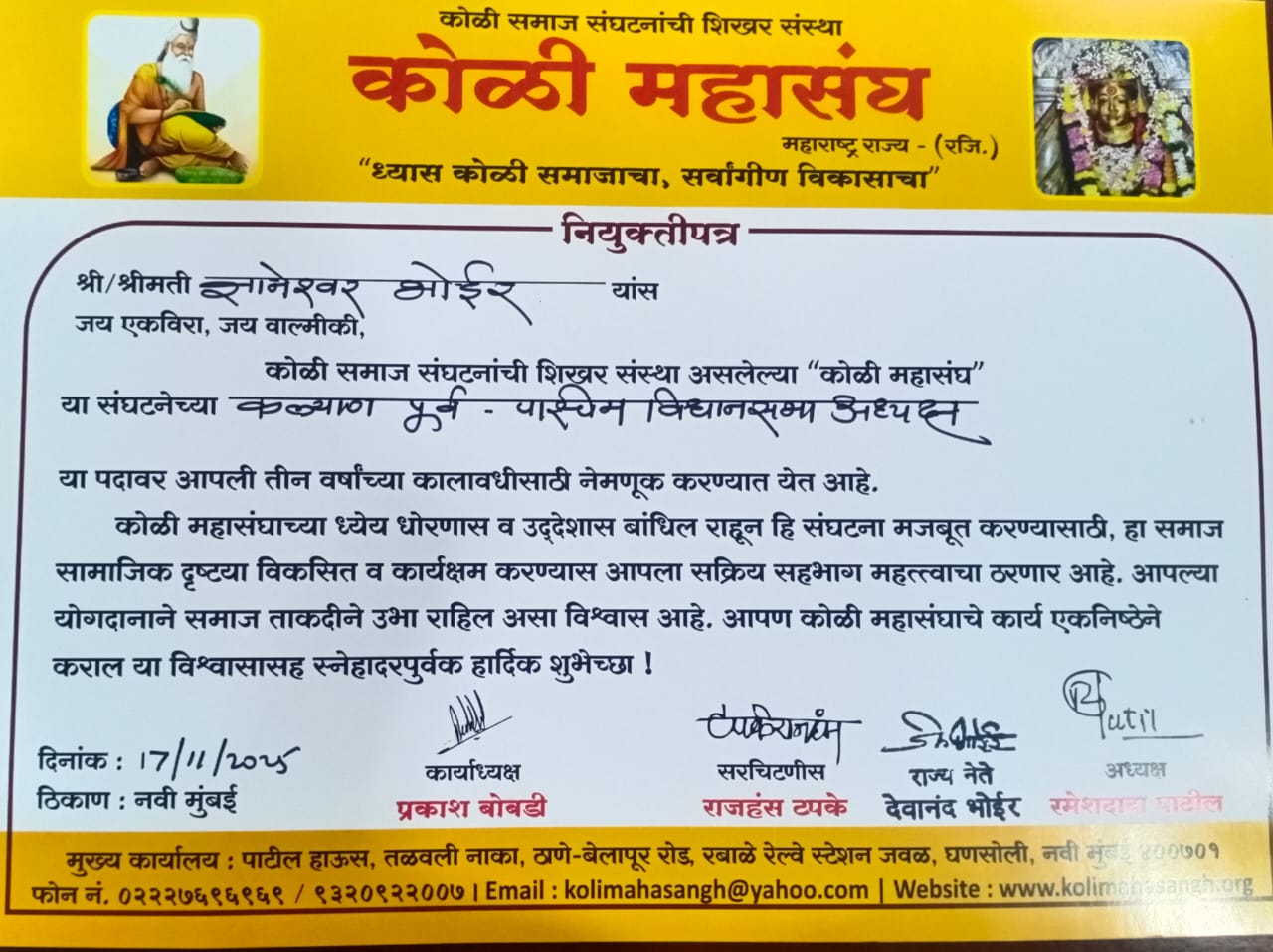 कोळी महासंघाच्या कल्याण विधानसभा अध्यक्ष पदी ज्ञानेश्वर भोईर