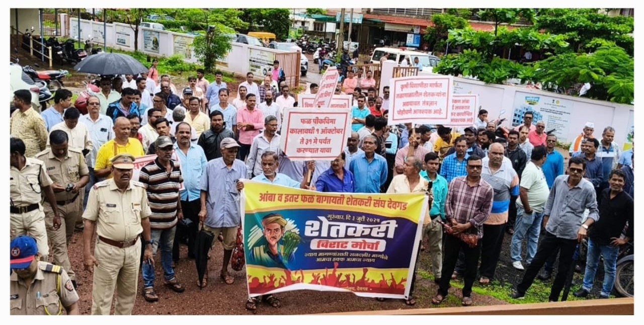 देवगड :-देवगड तालुक्यातील आंबा व इतर फळ बागायतदार शेतकऱ्यांनी बदलत्या हवामानामुळे निर्माण झालेल्या संकटाचा विचार करून शासन दरबारी आपले विविध मागण्यांसाठी आंबा व इतर फळ बागायतदार शेतकरी संघ, देवगड" या संस्थेच्यावतीने शेतकऱ्यांचा आक्रोश मोर्चा देवगड सातपायरी येथील नेने गणपती मंदिर ते तहसीलदार कार्यालयापर्यंत काढण्यात आला.तहसीलदारांची सविस्तर चर्चा करून"आंबा व इतर फळ बागायतदार शेतकरी संघ, देवगड" या संस्थेच्यावतीने विविध मागण्यांबाबतचे देवगड तहसीलदार यांना निवेदन देण्यात आले.