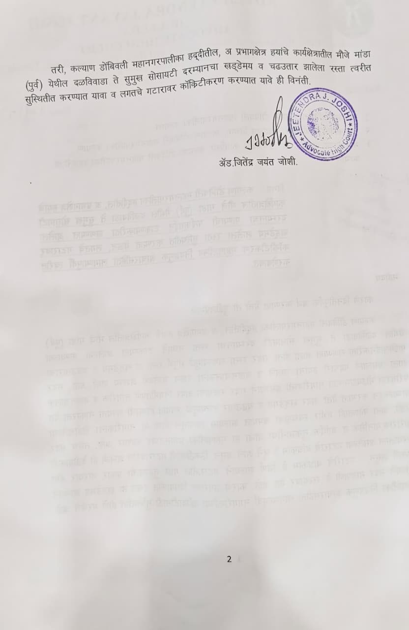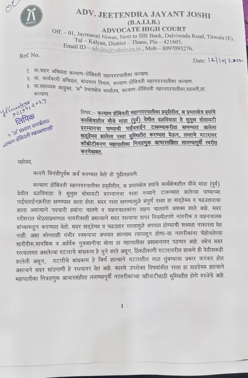 टिटवाळा:- टिटवाळा (पूर्व ) येथील दळवीवाडा येथील रस्त्याचे खोदकाम पाण्याची लाईन टाकण्याकरिता करण्यात आले होते. मात्र काम झाल्यानंतरही सदरील रस्त्याची डागडुजी केली गेली नव्हती. दरम्यान स्थानिक रहिवाशी अँडव्होकेट जितेंद्र जोशी यांनी केडीएमसीचे अ प्रभाग क्षेत्राचे सहाय्यक आयुक्त जयवंत चौधरी यांना काँकरीटिकरण निवेदन दिले होते. त्यानुसार सद्यस्थितीत तेथील डांबरीकरण करण्यात आले.