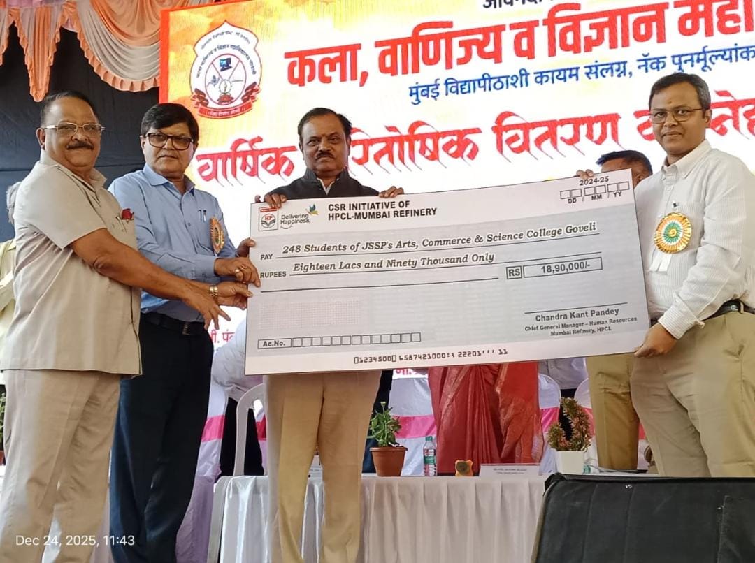 गोवेली : विद्यार्थ्यांच्या सर्वांगीण विकासासाठी सातत्याने कार्यरत असलेल्या जीवनदीप महाविद्यालय,गोवेली येथील गरीब,गरजू,होतकरू तसेच आर्थिकदृष्ट्या दुर्बल घटकातील विद्यार्थ्यांना हिंदुस्तान पेट्रोलियम कॉर्पोरेशन लिमिटेड (HPCL) यांच्या वतीने शिष्यवृत्ती प्रदान करण्यात आली आहे. पैशाअभावी कोणत्याही विद्यार्थ्याचे शिक्षण अर्धवट राहू नये,या उदात्त हेतूने HPCL मार्फत राबविण्यात येणाऱ्या शिष्यवृत्ती योजनेअंतर्गत विद्यार्थ्यांना भरीव आर्थिक सहाय्य मिळत आहे. शैक्षणिक वर्ष २०२२–२३ मध्ये एकूण ४७८ विद्यार्थ्यांना सुमारे २६ लाख रुपयांची शिष्यवृत्ती देण्यात आली होती. तसेच शैक्षणिक वर्ष २०२४–२५ मध्ये २४८ विद्यार्थ्यांना १८ लाख ९० हजार रुपयांची शिष्यवृत्तीचा लाभ मिळाला आहे. HPCL मध्ये वरिष्ठ व्यवस्थापक (आरोग्य विभाग) म्हणून कार्यरत असलेले डॉ. प्रफुल विशे यांच्या हस्ते महाविद्यालयाच्या वार्षिक पारितोषिक वितरण समारंभ व स्नेहसंमेलन प्रसंगी प्रातिनिधिक स्वरूपात धनादेश संस्थेचे अध्यक्ष रविंद्र घोडविंदे व प्राचार्य डॉ. अशोक वाघ यांच्याकडे सुपूर्त करण्यात आला. या कार्यक्रमास पंकज गिरी (वरिष्ठ पोलीस निरीक्षक,मांडा–टिटवाळा), दिनेश कथोरे (युवा नेता,भाजप),प्राची पाटील (प्रसिद्ध मुरबाडी बाई),चिता शेट्टी (ॲक्शन डायरेक्टर),डॉ. आशा गुंजाळ (तालुका वैद्यकीय अधिकारी),सुरेश गायकर,डॉ. प्रतीक्षा घोडविंदे आदी मान्यवर उपस्थित होते. या उल्लेखनीय सामाजिक व शैक्षणिक उपक्रमाबद्दल जीवनदीप शैक्षणिक संस्थेचे अध्यक्ष रविंद्र घोडविंदे,संचालक प्रशांत घोडविंदे,प्राचार्य.डॉ.अशोक वाघ,उपप्राचार्य प्रा.हरेंद्र सोष्टे,ग्रंथपाल.प्रा.राजाराम कापडी,पंकज मोरे तसेच महाविद्यालयातील विद्यार्थी व पालकवर्गाने HPCL आणि डॉ. प्रफुल विशे यांचे मनापासून आभार व्यक्त केले आहेत. दरम्यान,शैक्षणिक वर्ष २०२५–२६ साठी तब्बल ८०० विद्यार्थ्यांनी HPCL शिष्यवृत्तीसाठी अर्ज केले असून, आगामी काळात अधिकाधिक विद्यार्थ्यांना या योजनेचा लाभ मिळणार असल्याची माहिती महाविद्यालय प्रशासनाने दिली आहे.