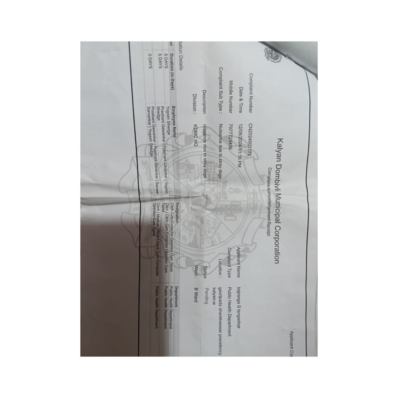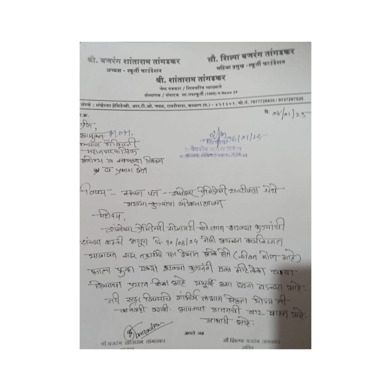 कल्याण - कल्याण शहरात भटक्या कुत्र्यांचा वावरामुळे सामान्य नागरिकांना त्रास होत आहे व कुत्रे चावण्याचा अनेक घटना घडल्या असून कल्याण मध्ये एक नागरीकाचा मुत्यू झाला आहे, तरीसुद्धा कल्याण डोंबिवली महानगरपालिका व आरोग्य विभाग भटक्या कुत्र्यांचा तक्रारीबाबत गांभीर्याने व कोणतीही धडक कार्यवाही करताना दिसत नाही, शंखेश्वर प्रेसिडेन्सी टावरी पाडा येथे मागील ७-८ महीन्यात अनेक घटना घडल्या याबाबत स्फूर्ती फाउंडेशन वतीने २ वेळा निवेदन कल्याण डोंबिवली महानगरपालिका मुख्य कार्यालय देण्यात आले परंतु कोणतीही कार्यवाही चे पत्र अथवा माहिती संबंधित विभागाकडून मिळाली नाही अशी माहिती स्फूर्ती फाउंडेशन अध्यक्ष बजरंग तांगडकर यांच्या कडून देण्यात आली.