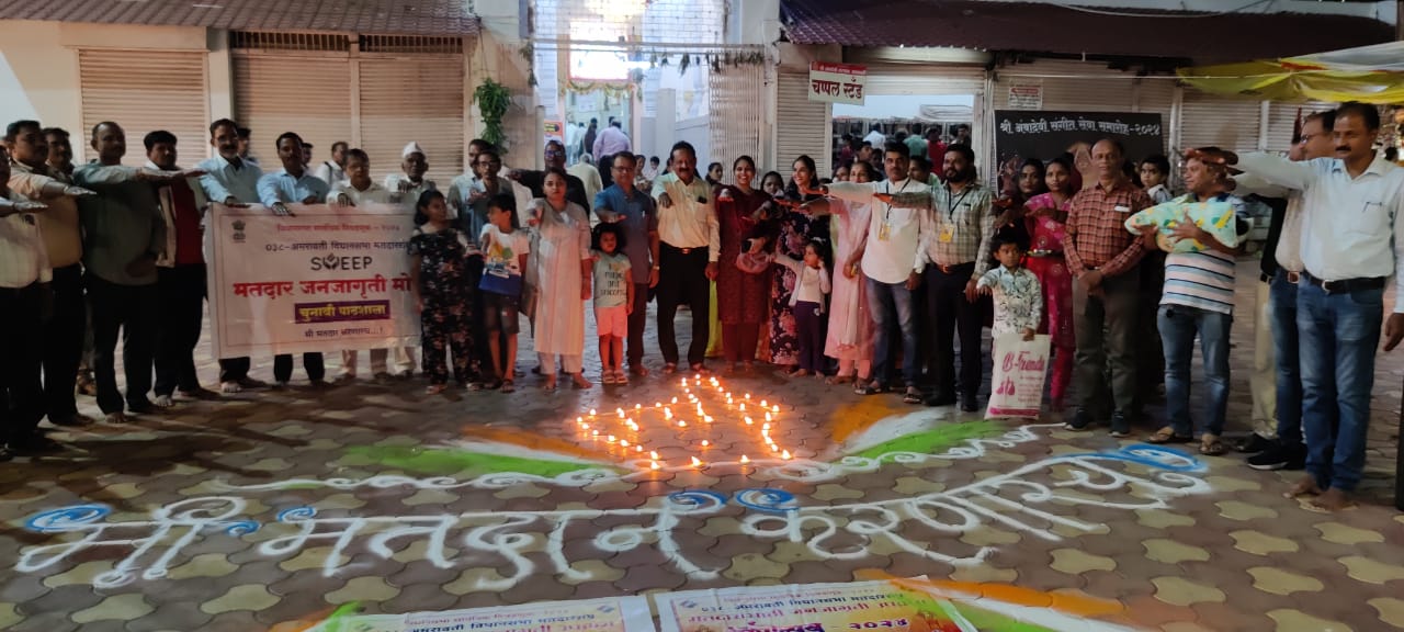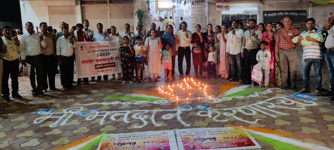 अमरावती दि.६-स्वीप कक्ष मनपा व स्वीप कक्ष जि.प.यांच्या संयुक्त विद्यमाने अंबादेवी परीसरात मंगळवारला सायंकाळी मतदान जनजागृती कार्यक्रमातंर्गत मतदानाचा दावा तेवत ठेवा असा संदेश देत दिवे लावून आणि मतदानाची शपथ देऊन करण्यात आली.यावेळी शेकडो नागरीक भक्त उपस्थित होते.