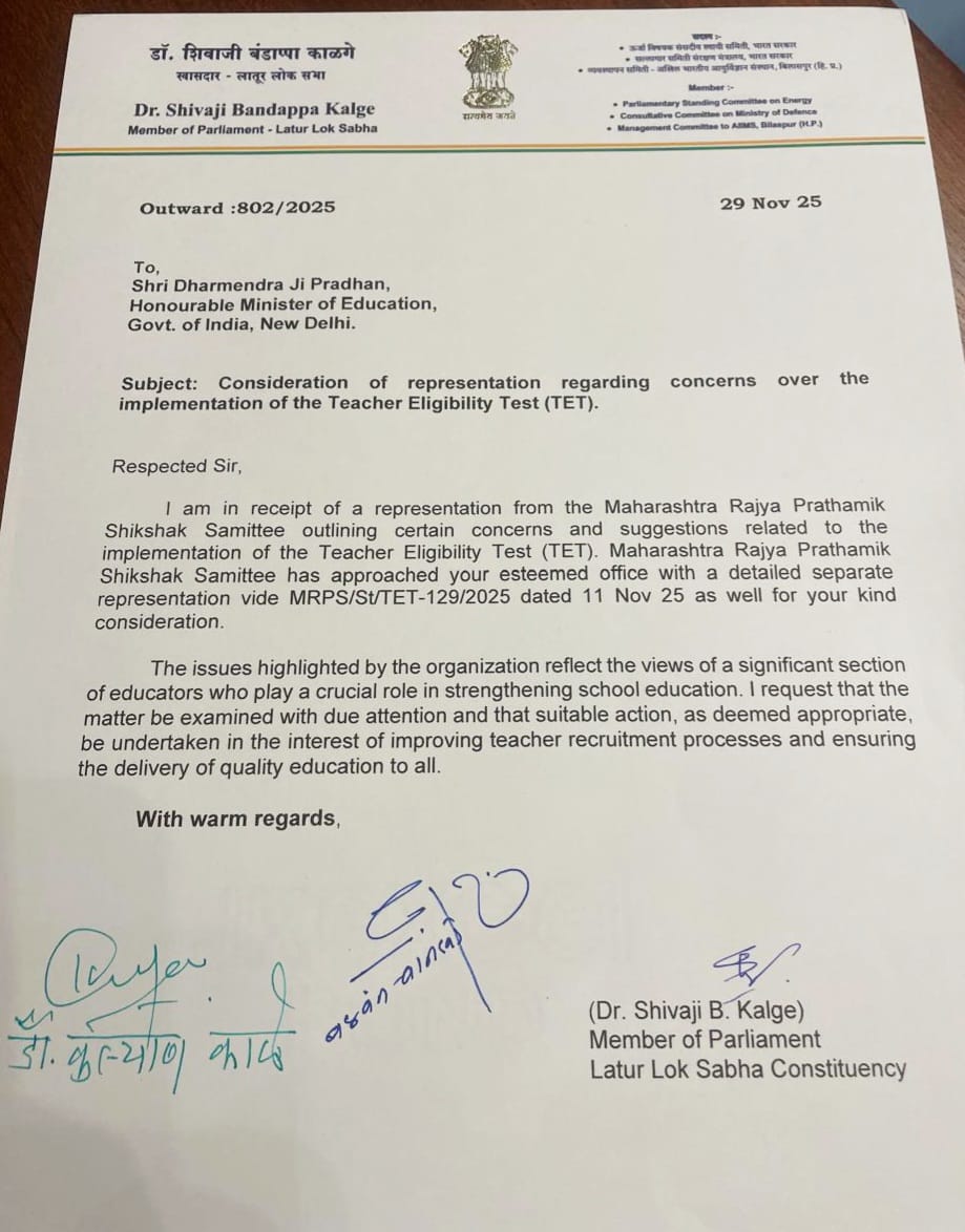 खा.डॉ शिवाजीराव काळगे(लातूर ),खा.अमर काळे(वर्धा) व खा.बळवंत वानखडे (अमरावती)खा.डाॅ.कल्यान काळे(जालना) या खासदार महोदयांनी शिक्षक टीईटी बाबतचे पत्र माननीय धर्मेंद्र प्रधान शिक्षणमंत्री महोदय,भारत सरकार दिले आहे.शिक्षक समितीने केलेल्या मागणीचा विचार करावा असे सदर पत्रात नमुद आहे.शिक्षक समितीचे राज्य नेते उदयजी शिंदे,राज्याध्यक्ष मा.विजयजी कोंबे व राज्य सरचिटणीस मा.राजन जी कोरगावकर यांच्या सूचनेनुसार समितीचे वसंत घोगरे यांनी या संदर्भात खासदार डाॅ.शिवाजीराव काळगे,आल्हाद तराळ यांनी बळवंत वानखडे,अमर काळे यांना विजय कोंबे,डाॅ.कल्यान काळे यांनी लेखी निवेदन दिले होते.तसेच राज्यातील सर्व खासदार लोकसभा व राज्यसभा सदस्य यांना निवेदन दिले होते.असे प्राथमिक शिक्षक समितीचे राज्य प्रसिध्दी प्रमुख राजेश सावरकर यांनी कळविले आहे.