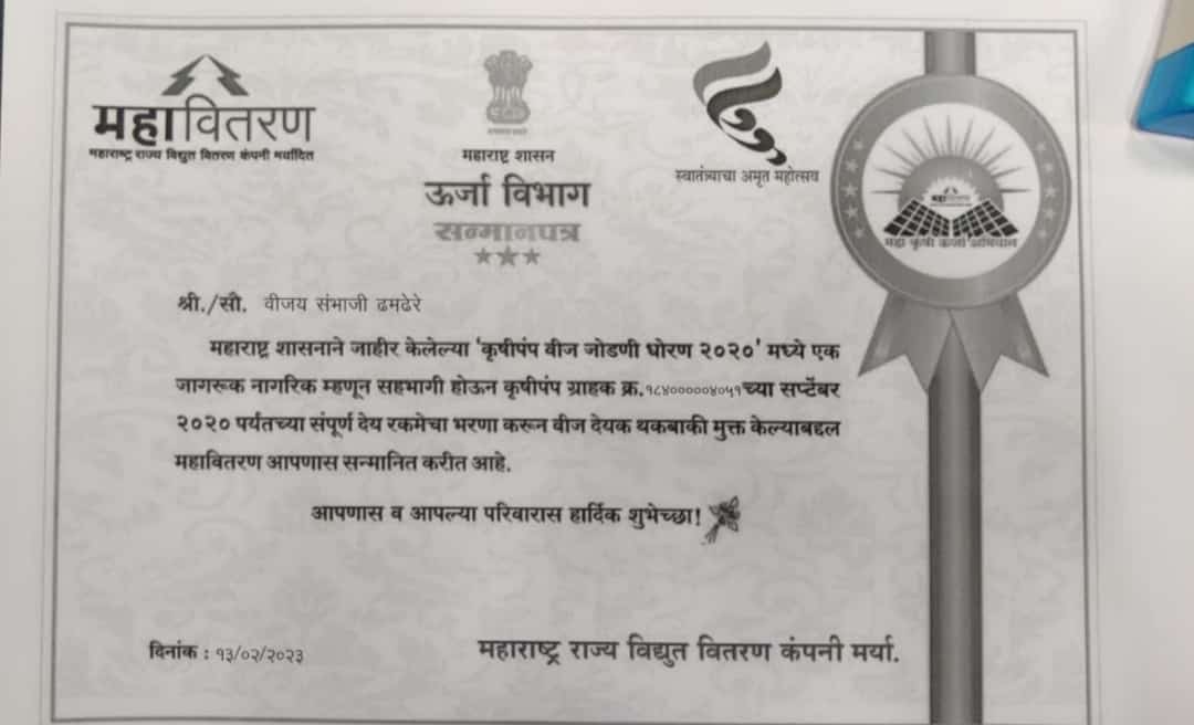 महाराष्ट्र शासनाने जाहीर केलेल्या कृषीपंप वीजजोडणी धोरण २०२० मध्ये एक जागरूक नागरिक म्हणून सहभागी होवून कृषी पंप ग्राहक सप्टेंबर २०२० पर्यंतच्या संपूर्ण देय रकमेचा भरणा करून वीज देयक थकबाकी मुक्त केल्याबद्दल महावितरण आपणास सन्मानित करीत आहे.