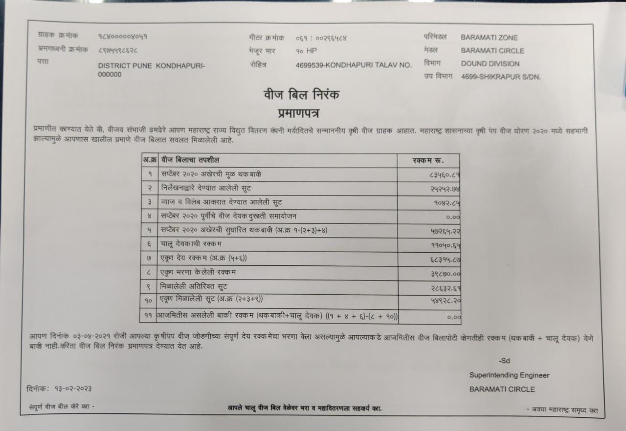 आपण दि. ३/०४/२०२१ रोजी आपल्या कृषीपंप वीजजोडणीच्या संपूर्ण देय रकमेचा पूर्ण भरणा केला असल्यामुळे आपल्याकडे आजमितीस वीजबिलापोटी कोणतीही रक्कम थकबाकी ,चालू देयक येणे बाकी नाही करिता वीजबिल निरंक प्रमाणपत्र देण्यात आहे असे सन्मानपत्रात म्हटले आहे.
