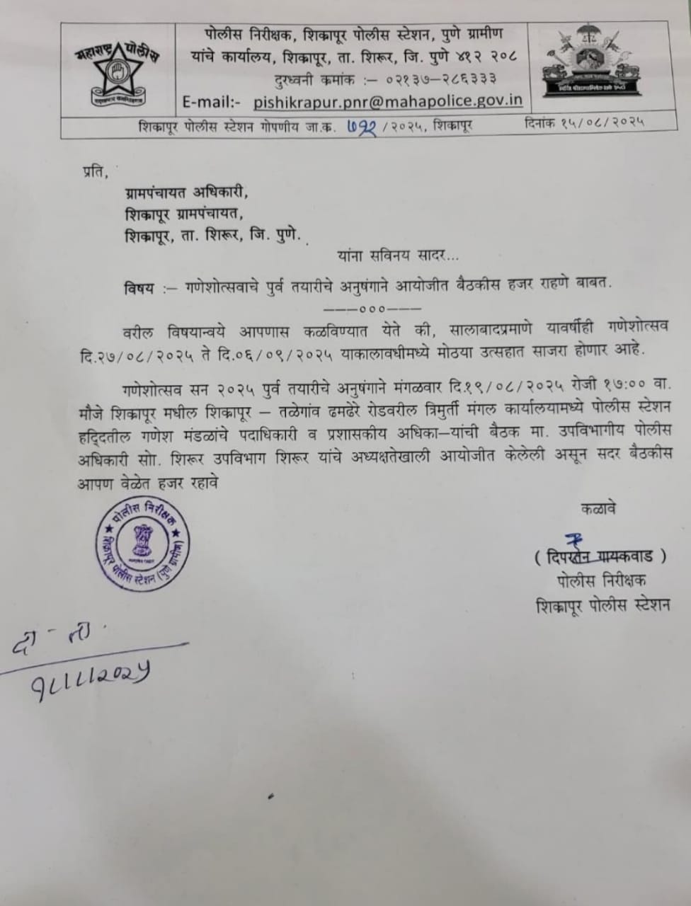 गणेशोत्सव सन २०२५ पूर्वतयारीचे अनुषंगाने मंगळवार दि.१९/०८/२०२५ रोजी ५ वाजता मौजे शिक्रापूर मधील शिक्रापूर -तळेगाव ढमढेरे त्रिमूर्ती मंगल कार्यालयामध्ये पोलीस स्टेशन हद्दीतील गणेश मंडळांचे पदाधिकारी, प्रशासकीय अधिका-यांची बैठक माननीय उपविभागीय पोलिस अधिकारी शिरूर उपविभाग शिरूर यांच्या अध्यक्षतेखाली आयोजित केलेली असून सदर बैठकीस आपण वेळेत हजर राहावे असे पत्रात म्हटले आहे.
