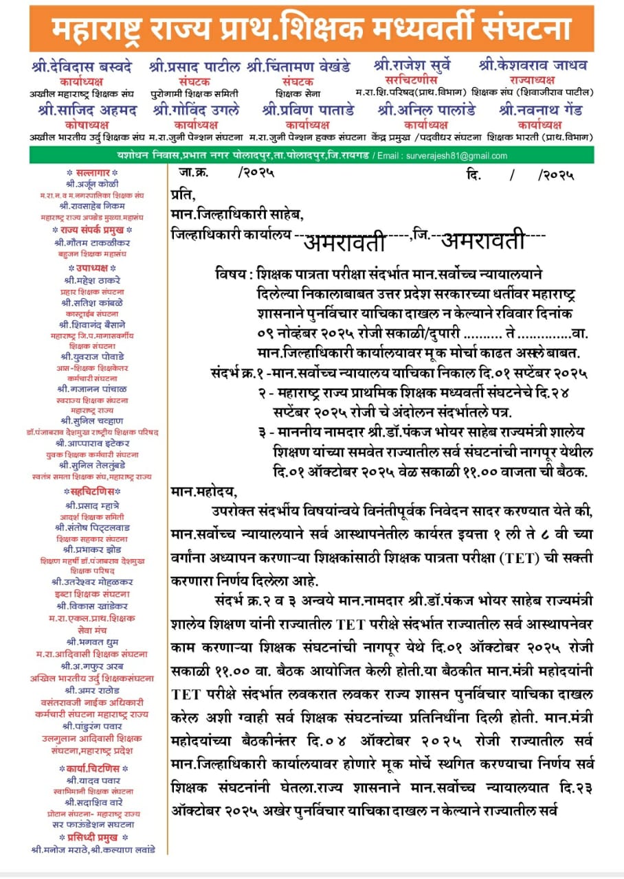 अमरावती: शिक्षक पात्रता परीक्षा टीईटीसंदर्भात सर्वोच्च न्यायालयाने दिलेल्या निर्णयामुळे राज्यातील प्राथमिक शिक्षकांचे भवितव्य अंधारात सापडल्याची भीती निर्माण झाली आहे. या पार्श्वभूमीवर शिक्षकांना संरक्षण देण्यासाठी राज्य सरकारच्यावतीने सर्वोच्च न्यायालयात पुनर्विलोकन याचिका दाखल करावी,या प्रमुख मागणीसाठी महाराष्ट्र राज्य प्राथमिक शिक्षक मध्यवर्ती संघटनेने ९ नोव्हेंबरला रोजी राज्यातील सर्व जिल्हाधिकारी कार्यालयावर शिक्षकांचा मूक मोर्चा काढण्याचे आयोजन केले आहे. शिक्षकांच्या विविध मागण्यांसाठी महाराष्ट्र राज्य प्राथमिक शिक्षक मध्यवर्ती संघटनेने मूक मोर्चाचे आयोजन केले आहे. राज्यातील सर्व शिक्षकांनी मोर्चात मोठ्या संख्येने सहभागी होऊन मोर्चा यशस्वी करावा,असे आव्हान मध्यवर्ती संघटनेचे सरचिटणीस राजेश सुर्वे यांनी केले आहे.तसेच अमरावती येथे ९नोव्हेंबरला सकाळी ११वाजता ईर्विन चौक ते जिल्हाधिकारी कार्यालयावर भव्य मूक मोर्चा काढण्यात येणार आहे.या मोर्चात प्राथमिक,माध्यमिक शिक्षकांनी मोठ्या संख्येने सहभागी व्हावे असे आवाहन अमरावती जिल्हा समन्वय शिक्षक समितीने केले आहे. राज्य प्राथमिक शिक्षक मध्यवर्ती संघटना आक्रमक महाराष्ट्र राज्य प्राथमिक शिक्षक मध्यवर्ती संघटनेच्यावतीने ४ ऑक्टोबर २०२५ रोजी राज्यातील सर्व जिल्हाधिकारी कार्यालयावर मूक मोर्चा काढण्याचा निर्णय घेण्यात आला होता,मात्र त्यापूर्वीच १ ऑक्टोबर २०२५ रोजी राज्याचे शालेय शिक्षण राज्यमंत्री डॉ. पंकज भोयर यांनी शिक्षक संघटनेच्या पदाधिकाऱ्यांची बैठक घेतली. त्यावेळी त्यांनी टीईटीबाबत शासनाच्यावतीने पुनर्विलोकन याचिका दाखल करण्यात येईल,असे सर्व संघटनेच्या पदाधिकाऱ्यांना अवगत केले होते. या आश्वासनानंतर संघटनेचा मूक मोर्चा स्थगित करण्यात आला होता. शासनाच्यावतीने कोणत्याही प्रकारची सर्वोच्च न्यायालय पुनर्विलोकन याचिका दाखल करण्यात आली नाही. यामुळे शासनाच्या विरोधात ९ नोव्हेंबर २०२५ रोजी राज्यातील सर्व जिल्हाधिकारी कार्यालयावर मूक मोर्चा काढण्याचे आयोजन करण्यात आले आहे. या आहेत प्रमुख मागण्या १)टीईटी परीक्षा रद्द करा,या प्रमुख मागणीसह शिक्षण सेवक पद्धत रद्द करण्यात यावी. २)१५ मार्च २०२४चा संच मान्यता शासन आदेश रद्द करण्यात यावा. जुनी पेन्शन योजना लागू करा. सर्व ऑनलाइन कामे रद्द करा. ३)राज्यातील सर्व विषय शिक्षकांना पदवीधर वेतनश्रेणी लागू करण्यात यावी. वस्तीशाळा शिक्षकांची मूळ सेवा ही सेवासातत्यासाठी गृहीत धरण्यात यावी. शिक्षकांमध्ये अस्वस्थता,पदोन्नत्यादेखील थांबल्या टीईटी संदर्भामध्ये शिक्षकांमध्ये कमालीची अस्वस्थता निर्माण झाली अस