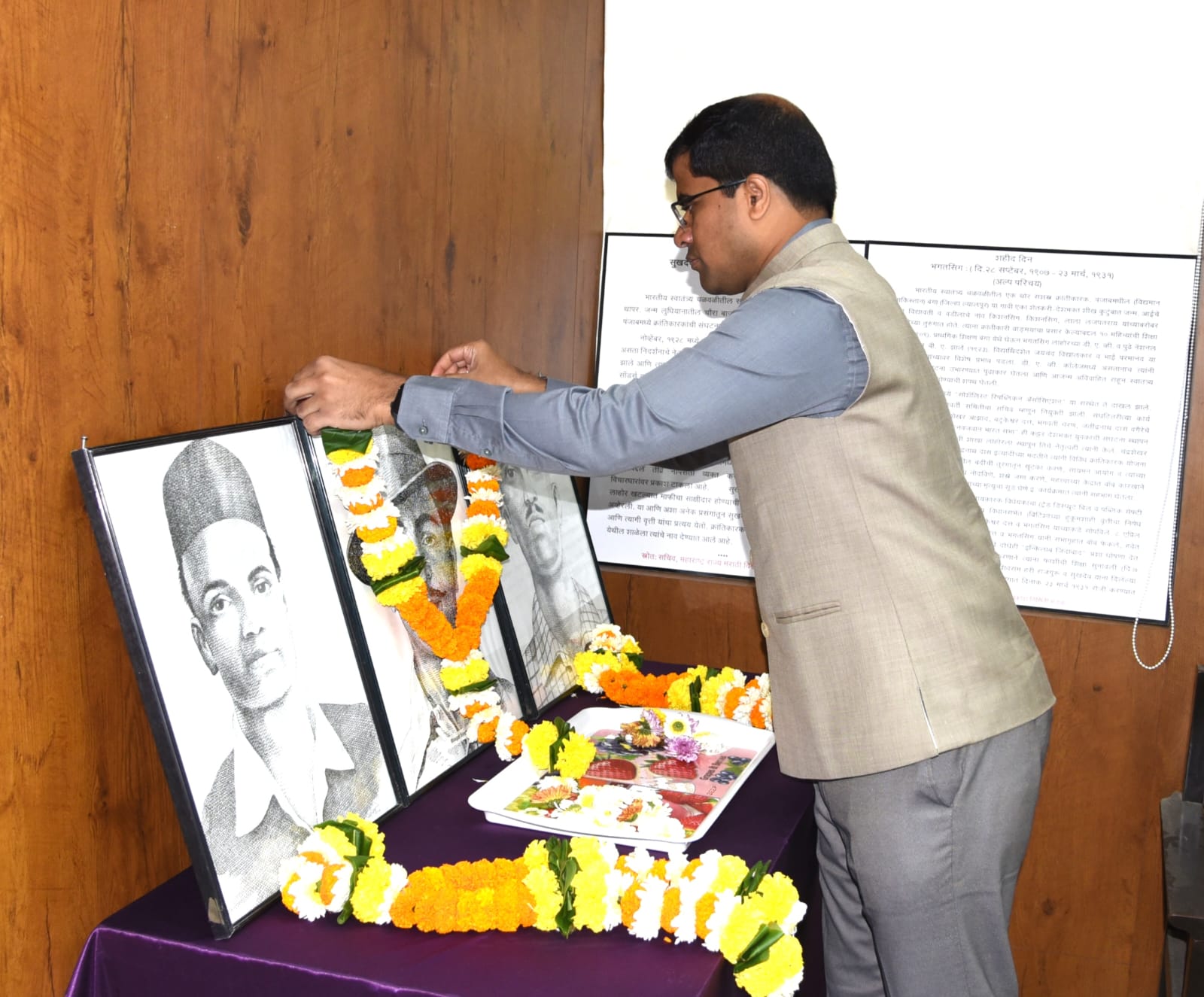 ठाणे :- शहीद दिनानिमित्त जिल्हाधिकारी श्रीकृष्ण पांचाळ यांनी आज जिल्हाधिकारी कार्यालयात शहीद भगतसिंग,राजगुरू आणि सुखदेव यांच्या प्रतिमेला पुष्पहार अर्पण करून अभिवादन केले. यावेळी अपर जिल्हाधिकारी हरिश्चंद्र पाटील,निवासी उपजिल्हाधिकारी डॉ.संदीप माने,उपजिल्हाधिकारी सर्जेराव मस्के- पाटील,शशिकांत गायकवाड,वरूणकुमार सहारे,उपजिल्हा निवडणूक अधिकारी वैशाली माने,तहसिलदार सचिन चौधर,रेवण लेंभे,मीनल दळवी,कार्यकारी दंडाधिकारी पुरुषोत्तम थोरात,लेखाधिकारी आश्लेषा जाधव,राष्ट्रीय सूचना व विज्ञान केंद्राचे संचालक घनश्याम मेहता तसेच जिल्हाधिकारी कार्यालयातील इतर अधिकारी व कर्मचारी उपस्थित होते.