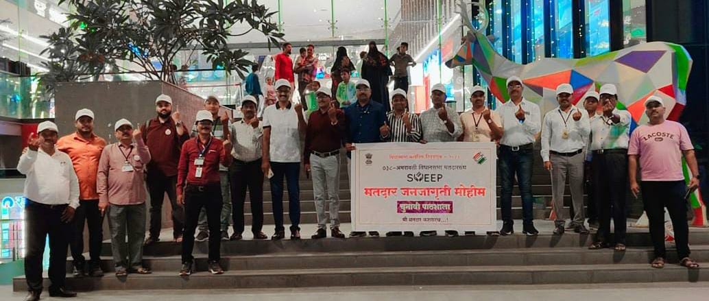 विधानसभा निवडणुकीत मतदान टक्केवारी वाढावी याकरिता प्रशासन विविध उपक्रमाच्या माध्यमातून जनजागृती करताना दिसून येत आहे परंतु मतदानावेळी सुशिक्षित वर्ग मतदानापासून वंचित राहत असल्याचा अनुभव बघता सुशिक्षित नव मतदारांना सुद्धा याबाबत जागृत करणे यावे या उद्देशाने अमरावती येथील स्थानिक तापडिया मॉल येथे उपस्थित शेकडो मतदार नागरिक यांना यावेळी मतदानाचा अधिकार बजावणी बाबत आवाहन करण्यात आले तसेच मतदानाची शपथ सुद्धा यावेळी देण्यात आली.